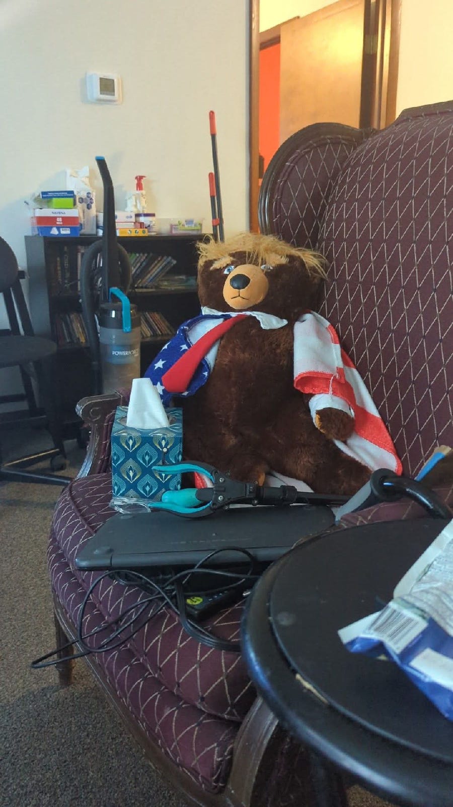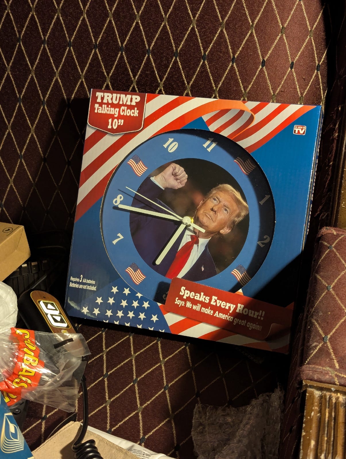 My buddy left and came back with my Christmas present which I’m going to show you in my pictures. It’s a talking Trump clock.